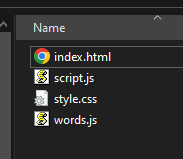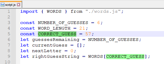 By taking a quick glance we can see that at the start we import WORDS from “words.js”.After that we set a const variable CORRECT_GUESS and set it to 57. We then initiate a variable called “rightGuessString” with the CORRECT_GUESS (57) index in the WORDS array.