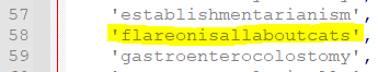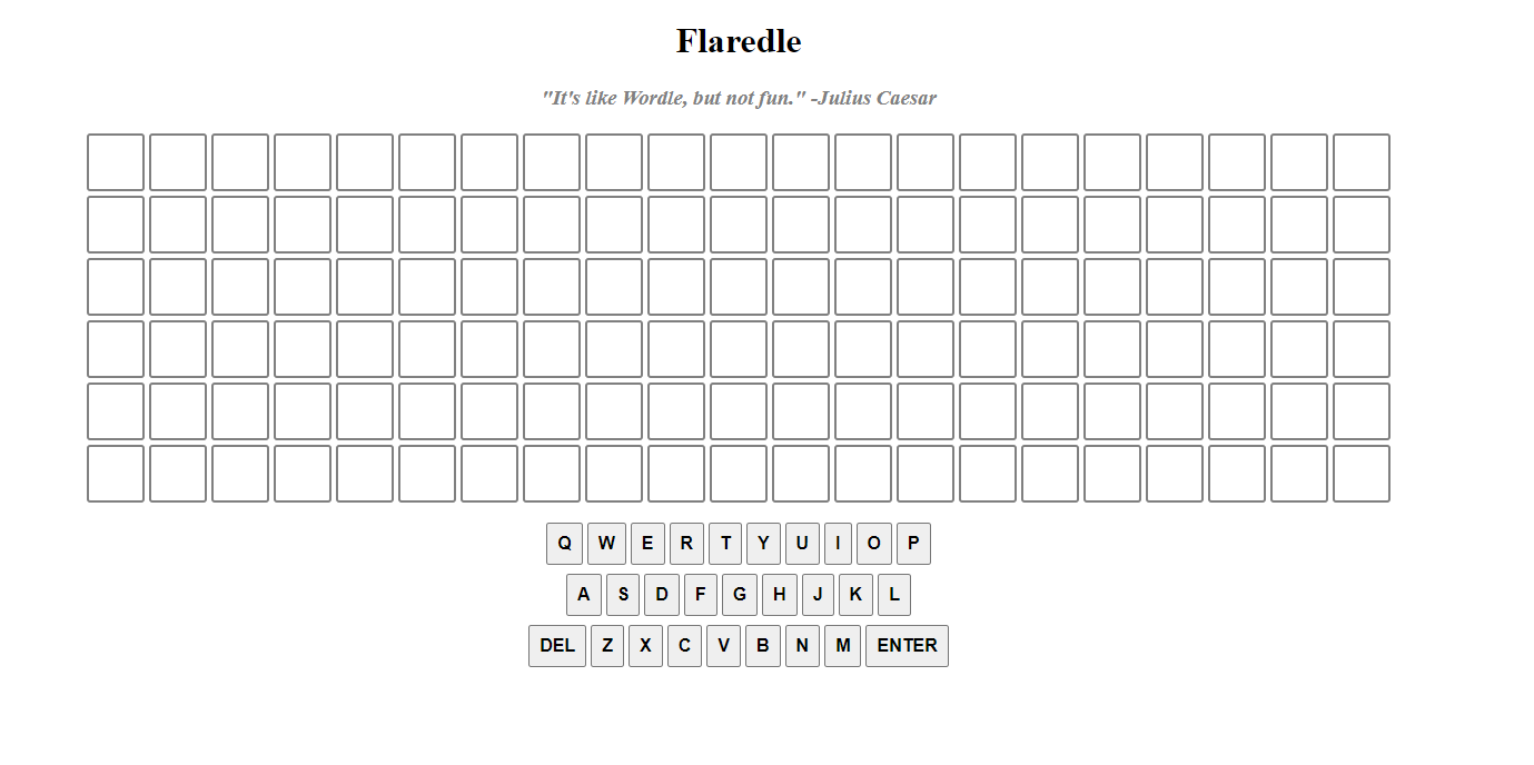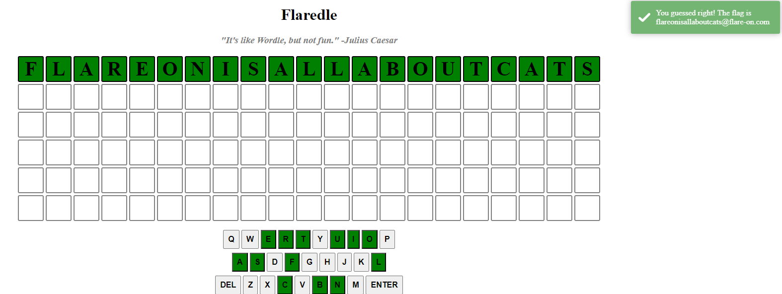 So we can see the string “flareonisallaboutcats” is the value put in “rightGuessString”, and if we try to put it in the flaredle we get: