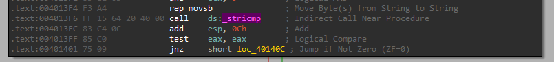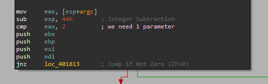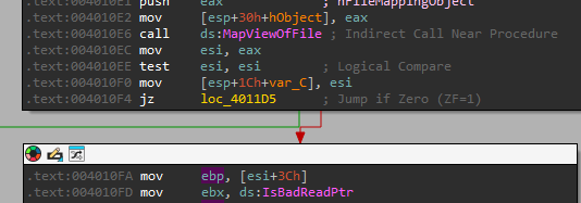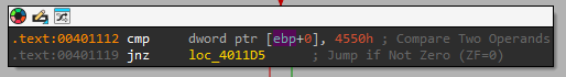 After that we can see that it compares the value at the pointer location (that we moved to ebp) to 0x4550=”EP” - which stands for the signature “PE” at the start of the header.