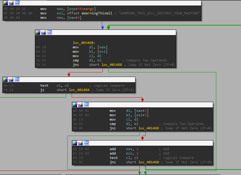 And we can see right after that it preforms a comparison between the second argv (our parameter) and a hard-coded string: "WARNING_THIS_WILL_DESTROY_YOUR_MACHINE"