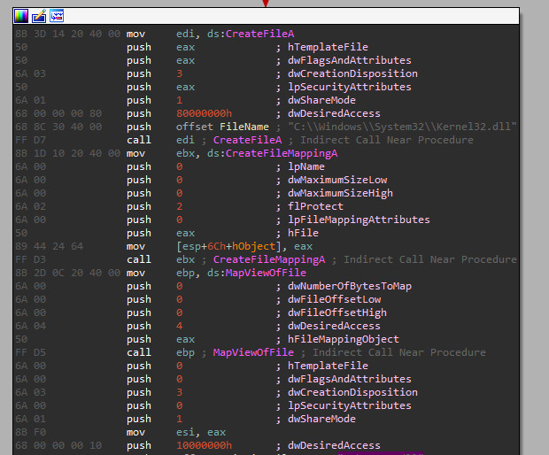 - (CreateFileA) Open the file: “C:\Windows\System32\Kernel32.dll”