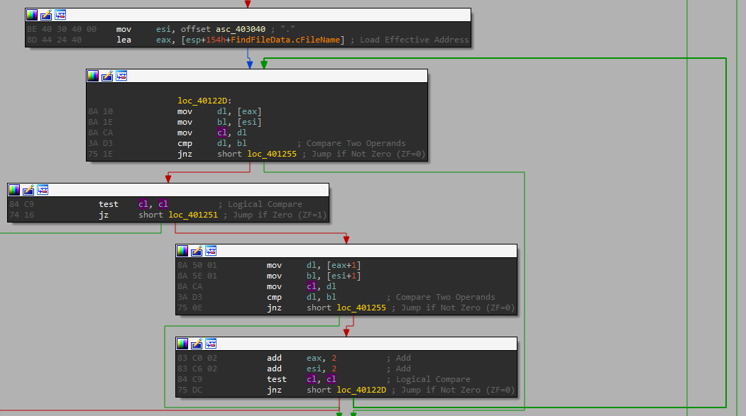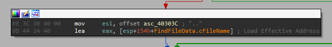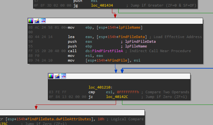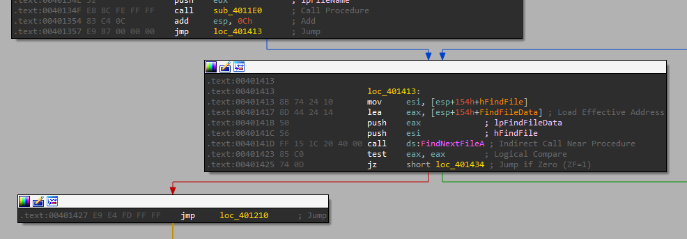 Which calls FindNextFileA to continues a file search from a previous call to the FindFirstFile, and after that we see a jump back to the start, so this function happens in a while loop until we go over all files and directories in the system.