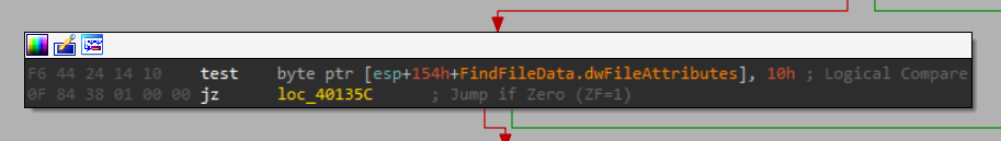 After that it checks if the file found is a directory, based on “dwFileAttributes” returned from the call: