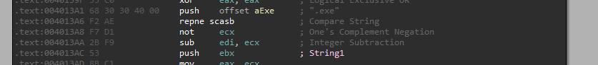 Because this part has a lot of arithmetic operations, including “repne scasb” and “rep movsd/b” instructions, we can debug it in x64dbg instead of analyzing every instruction to make our analysis faster.