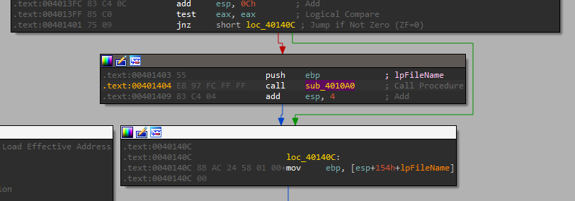 Those 2 subroutines are almost the same, and both call “sub_401000”, and because it calls them after it opens both DLLs, they are probably related to calculating something or modifying the files in some way.