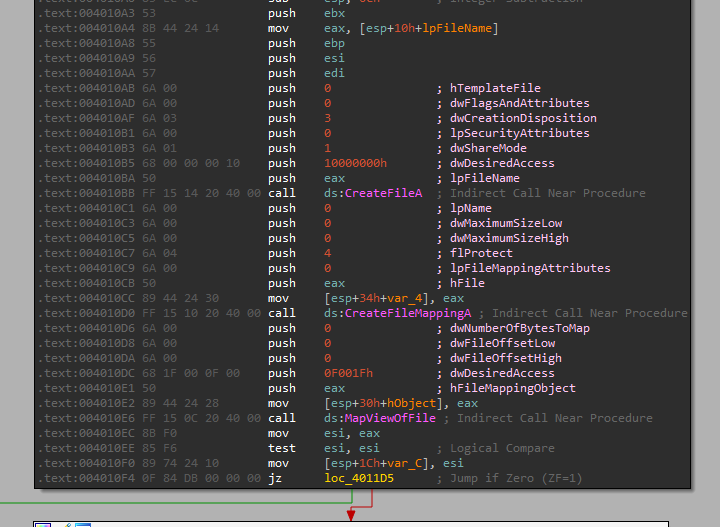 Based on those API calls, we can infer that the files are mapped into memory and then they will be modified by this program.