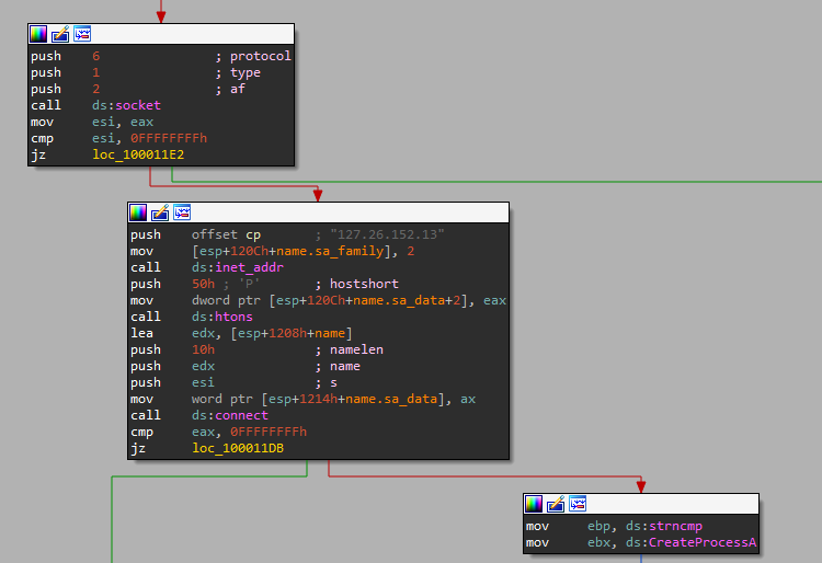 Then we can see the usage of sockets, including an ip address and port - probably of the c&c.