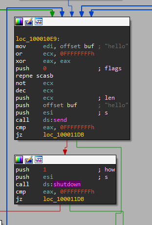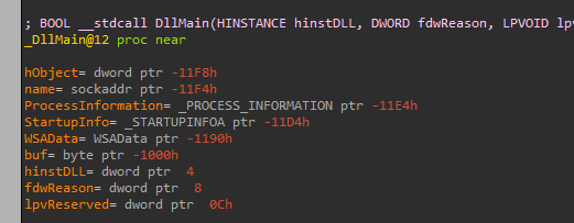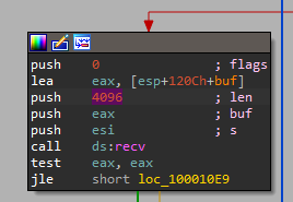 We can see it is after the buf local variable, and after the “var_FFF”, but if we take a look where it writes to “buf”, when it receives the data from the network, we can see: