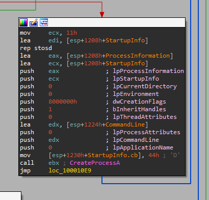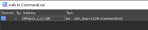 The interesting argument for the call to CreateProcessA is the CommandLine, but if we xref it to see its value: