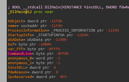We can see there is no write to it, only the read in the call to CreateProcessA, weird, let’s look at the local variables and function arguments: