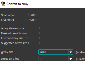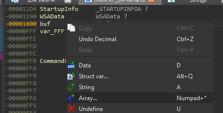 So it writes to the buffer 4096 bytes, a lot longer than IDA gave “buf”, let’s convert it to an array to make it easier to understand: