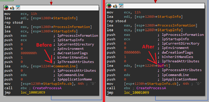 So now when we look at the section where it provides the lpCommandLine, we can see its the 5th byte in buf variable: