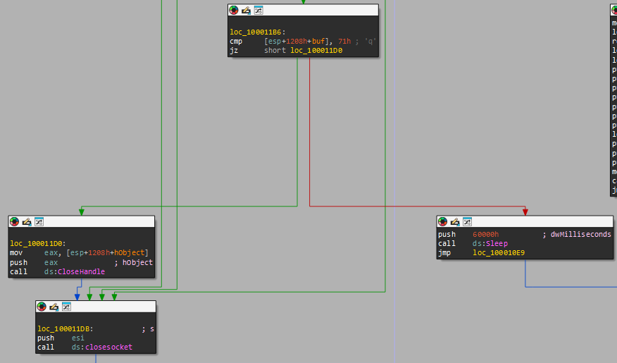 That means that if he wants to execute something, it sends “exec FULL_PATH_TO_FILE” - the “+5” is to omit “exec “ from the lpCommandLine. - If “q” is sent: it shutdowns the c2 and exit the loop.
