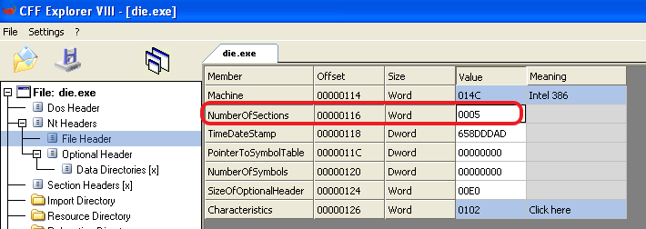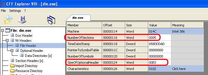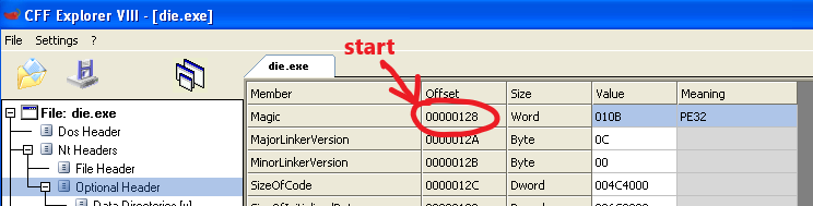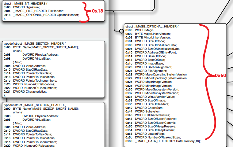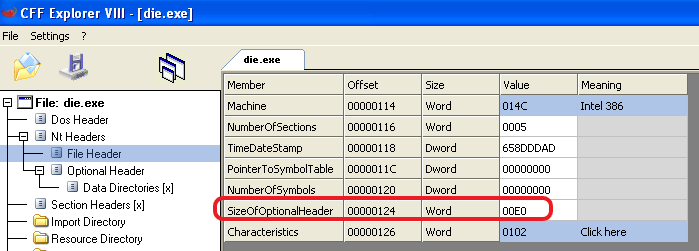 To calculate that address, we can start by finding the size of the optional header (found in the _IMAGE_FILE_HEADER) and add it to the offset to the start of the optional header (start of _IMAGE_OPTIONAL_HEADER).