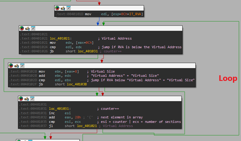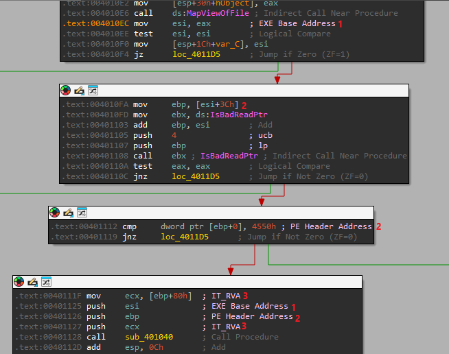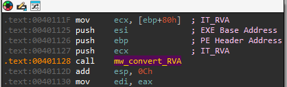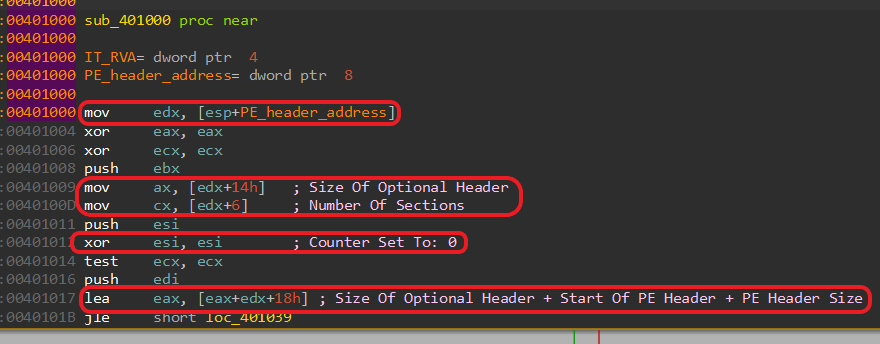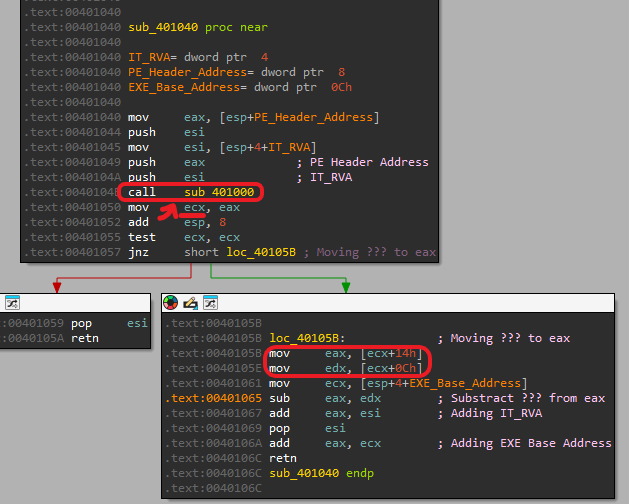 We can take a look and see that our guess before analyzing the subroutine was correct, and the calculation in sub_401040 is indeed: Return Value = RVA - (sub_401000 return value +0x0C)??? + (sub_401000 return value +0x14)??? + “EXE Base Address” And if we translate that: Return Value = RVA - “Virtual Address” + “Raw Address” + “EXE Base Address”