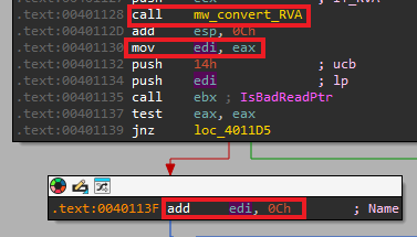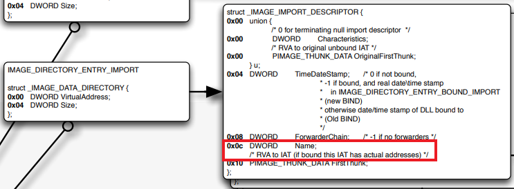 Right after that we can see that we take the return value of the call, and add 0x0C to it, that will get us the “Name” field in the _IMAGE_IMPORT_DESCRIPTOR struct (which is pointed to by the IMAGE_DIRECTORY_ENTRY_IMPORT that we just translated his RVA):
