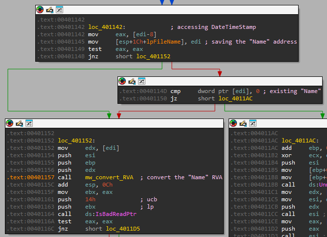 After that it makes some checks to see if the field TimeDateStamp in _IMAGE_IMPORT_DESCRIPTOR is not zero as well as we have a valid name RVA value. Then, if it’s non zero, it will convert the “Name” RVA to the linear file address.