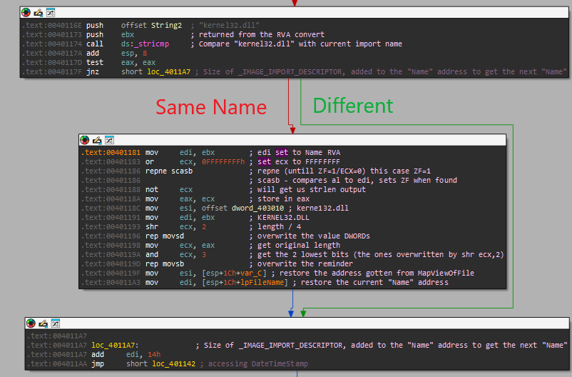 Right after that, it will start by checking if the “Name” is equal to “kernel32.dll”, “Name” being the name of the first DLL imported that it found in the file IAT. Based on if it found the “kernel32.dll”, it will do the following: