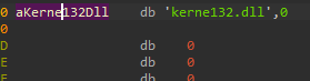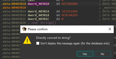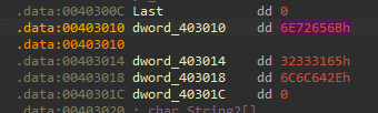 Because we know we write those values over the name of the import “kernel32.dll”, let’s convert those to a string and see what they stand for. To do that, we click “dword_403010” and press “A” on it: