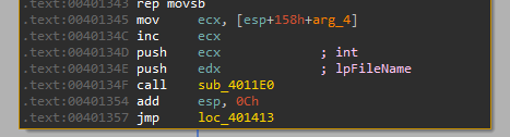 - Overwrite that value with the value at “dword_403010” (first with big chunks of 4 bytes at a time, then the reminder 1 byte at a time)