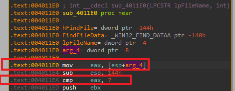 Right after that, we can see it passes this string “C:\\*” as an argument, as well as 0 to “sub_4011E0”, let’s understand what this sub does: