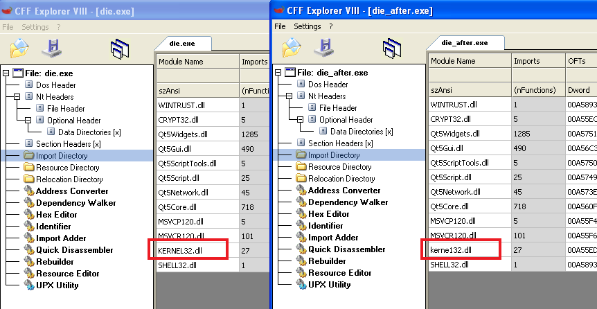 Here is the example of an executable before and after the malware being run on the machine, we can take a look at the imports and see that “KERNEL32.DLL” was replaced with “kerne132.dll” as we saw in our analysis.