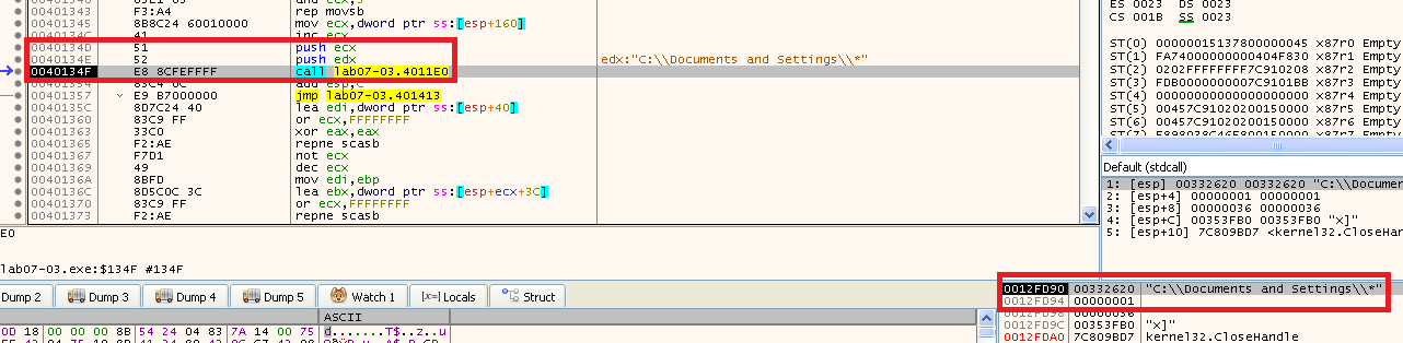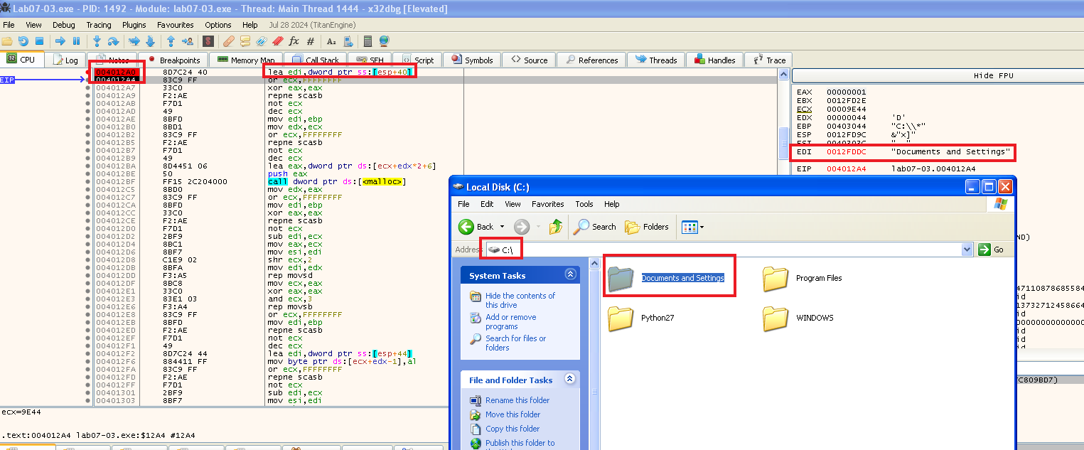 So let’s go over it quikly in x64dbg and see what it does, let’s go to the start after it found a folder at 0x004012A0, where we can see the name of the folder found “Documents and Settings”: