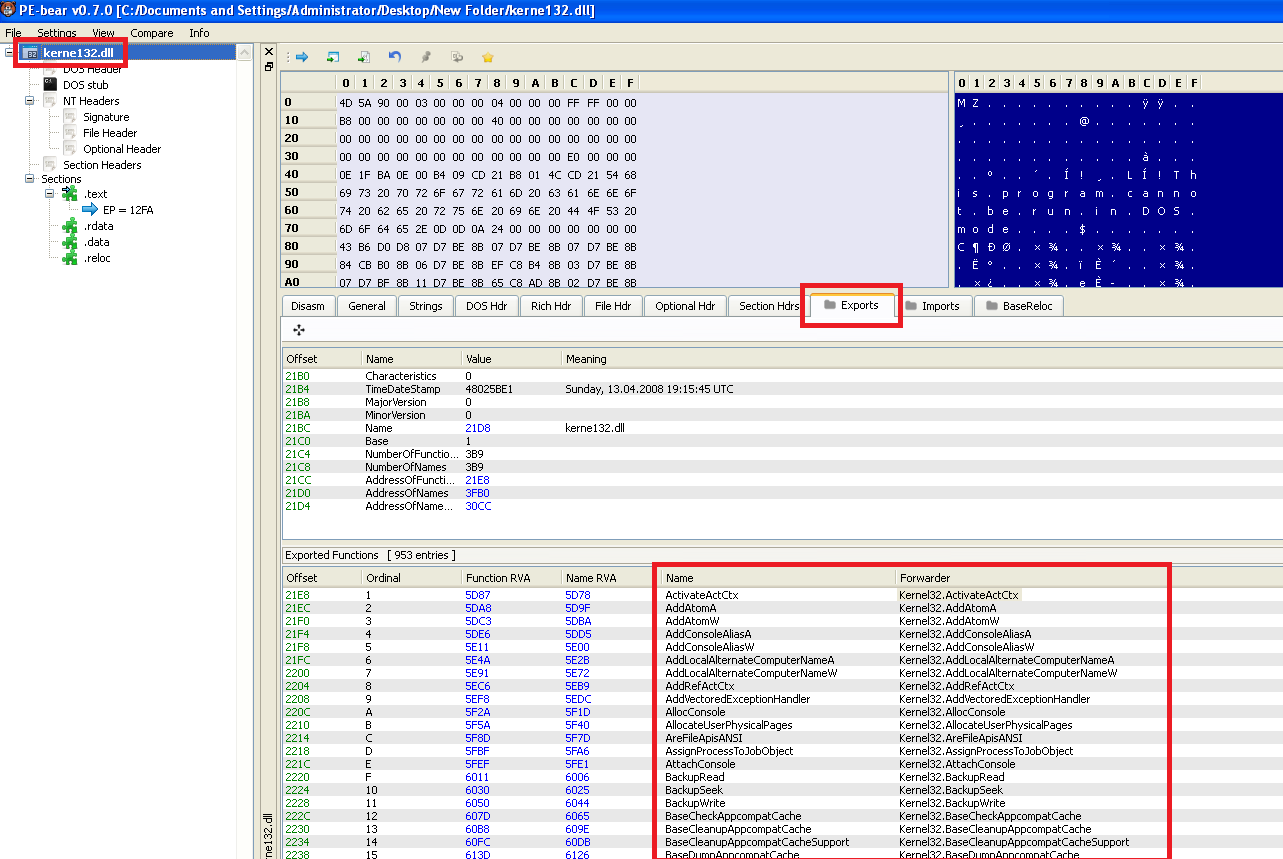If we open the new one in a tool like PE-Bear or pestudio and go to the exports we can see that every export of KERNEL32.DLL was added to kerne132.dll (the renamed Lab07-03.dll) with a forwarding for every export to KERNEL32.DLL.