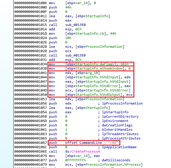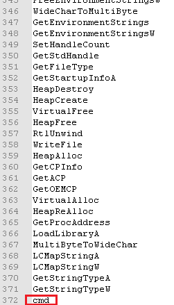 After that we can see that the command line of CreateProcessA is set to “cmd”.