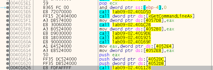 First, we need to find main. Again we do this by searching after the call to GetCommandLineA for a function that takes 3 arguments, and we found “sub_401128”: