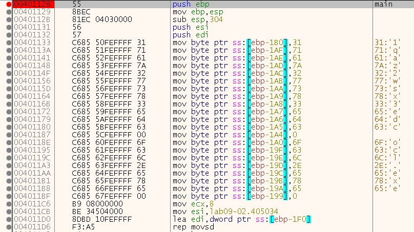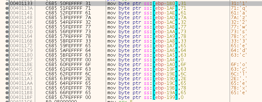 We already saw that part in question 3, this is where the malware builds two strings by moving the hex values into local variable offsets.