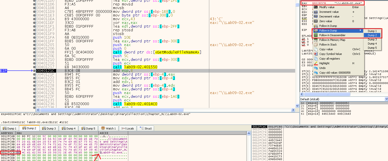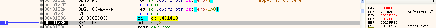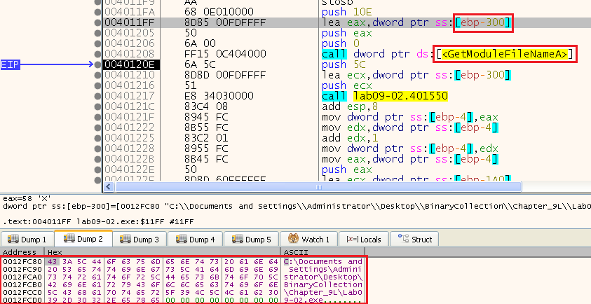 So one of them is the string we found at the start, and the other is the name of our executable (it removed the path including the “\” by adding 1 to the string address)