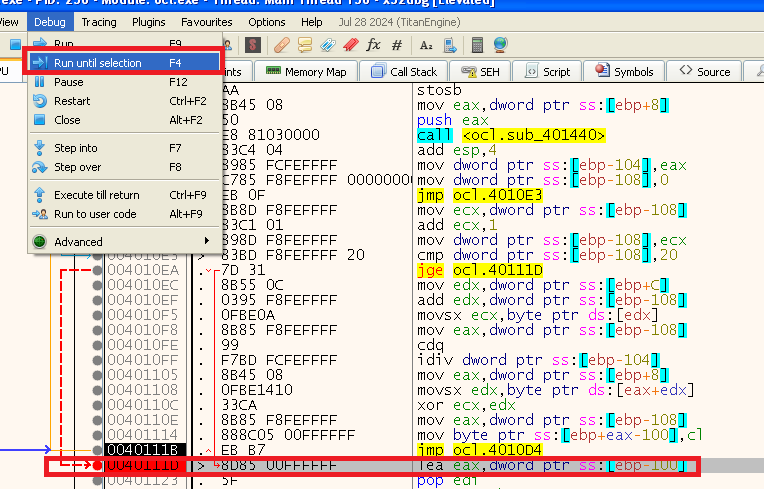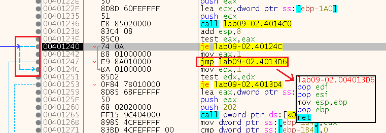We can see that it returned eax = 1, meaning it doesn’t take the “je” at 0x401240 so it just jumps to the end of the program.