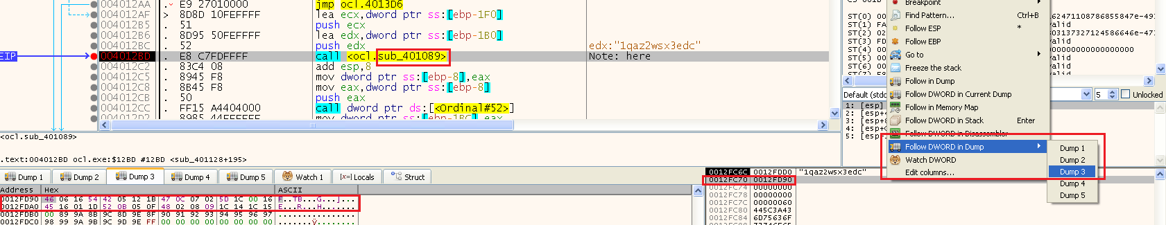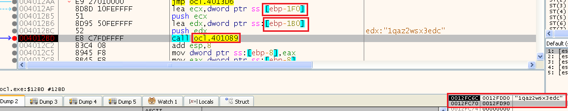 Right after those two calls, we can see the call to the subroutine 0x00401089, and we can see that it is passing to it: