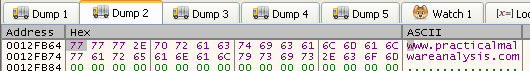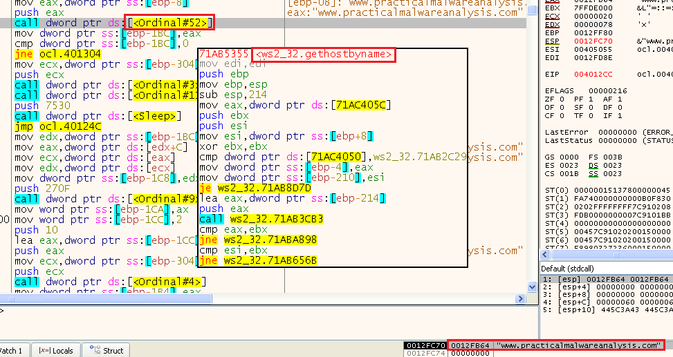 We can see the call to GetHostByName with the URL - “www[.]practicalmalwareanalysis[.]com” that was decrypted just before: