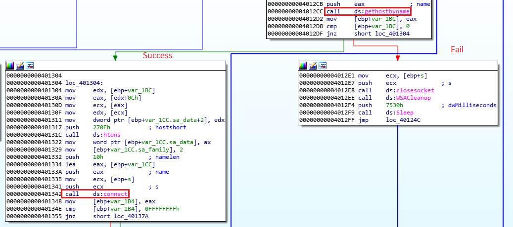 In this situation, we can run fakenet for example to pass this section by making the malware think it succeeded with getting the connection… but we can continue for now in IDA.
