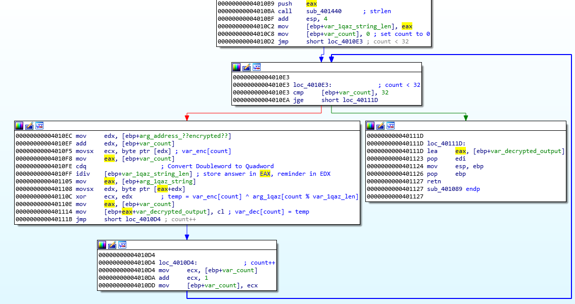This function takes a key and an encrypted buffer with the length of 32 chars, decrypts the buffer by XORing it with the key (And because it is XOR, it can be done both ways, to encrypt/decrypt).