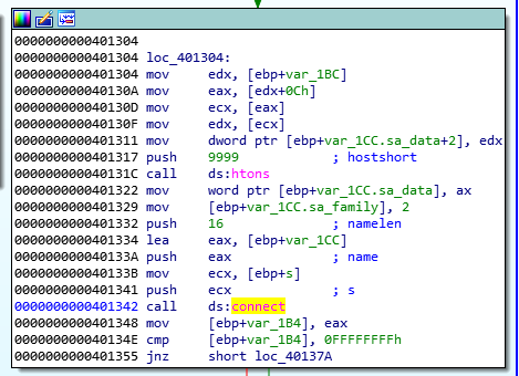 After the routine that gets the IP, we can see that it tries to connect to the IP it got on port 9999: