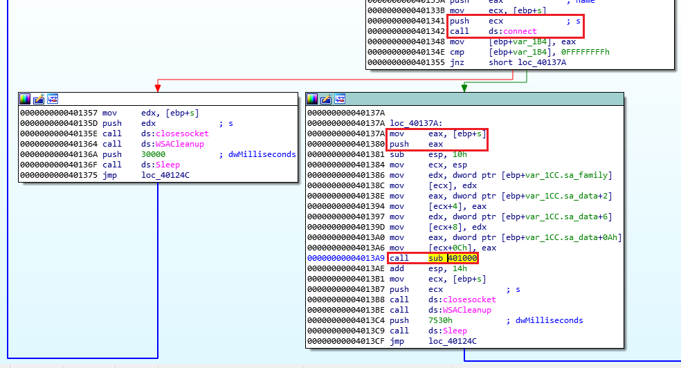 If it failes it sleeps for 30 seconds, and loop back to the start. If it succeedes, we can see a call to sub_401000, right before we close the socket, and the only parameter we send this subroutine is the socket: