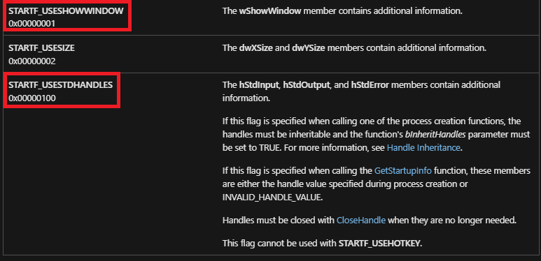 Now we can take a look at a few things, to understand more what is happening here we need to take a look at CreateProcessA’s lpStartupInfo - STARTUPINFO.