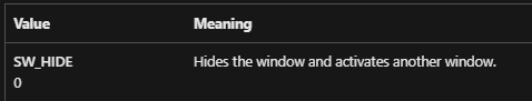 - ShowWindow - We can see that it set it to zero, if we take a look what it stands for: