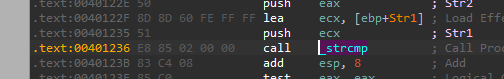 We can guess that this function compares the two strings with each other, so this is a short function named “strcmp” - we can also open it in IDA and see what it recognized it as: