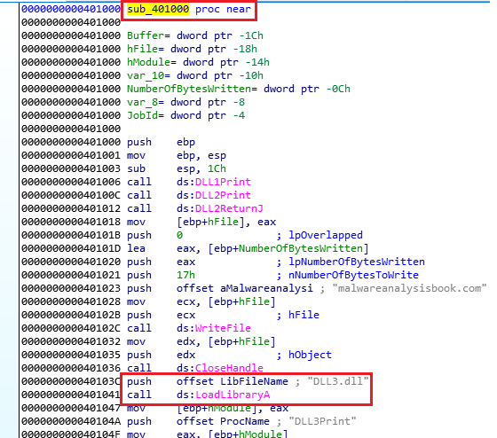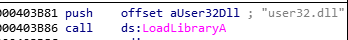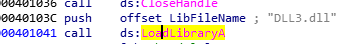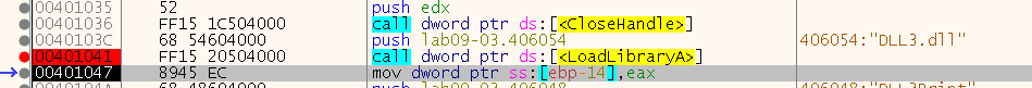 We first need to find out where DLL3.dll is being loaded at because its the only one not in the Import Table, so we need to make sure it is executed and loaded by LoadLibraryA: