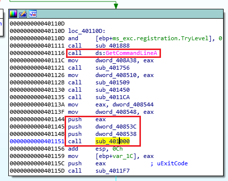 By xrefing sub_401000 we can see it is being called from the start, and right after GetCommandLineA with 3 parameters passed to it, so it looks like this is main: