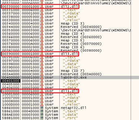 3. When you use OllyDbg to debug Lab09-03.exe, what is the assigned based address for: DLL1.dll, DLL2.dll, and DLL3.dll?
