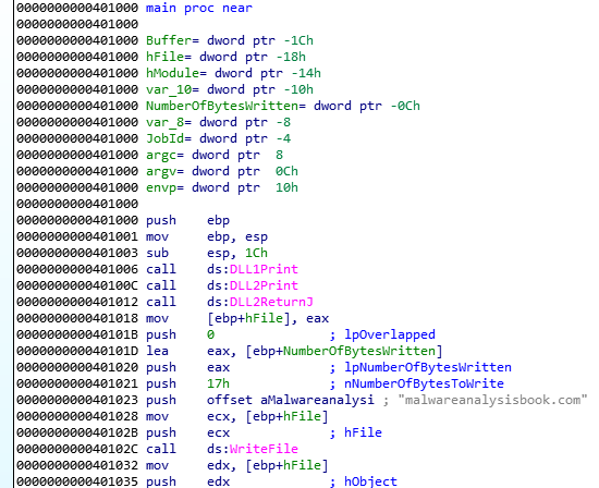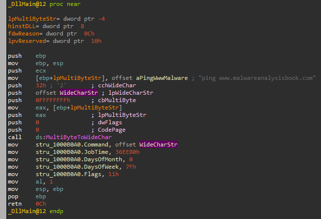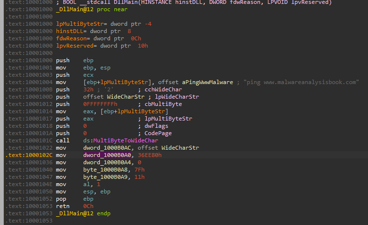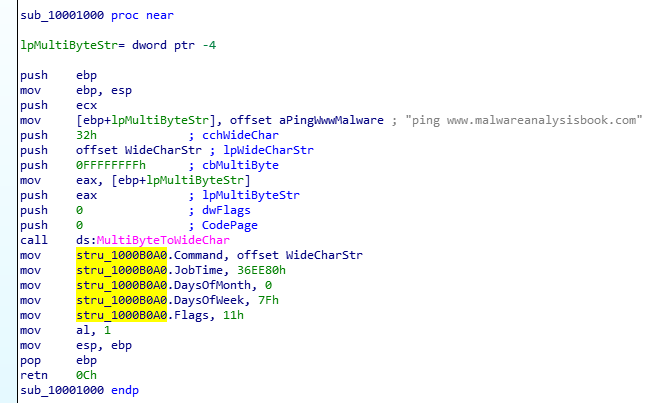 As we can see it prints the address of the string “ping www[.]malwareanalysisbook[.]com”