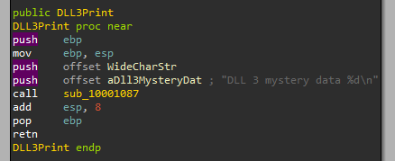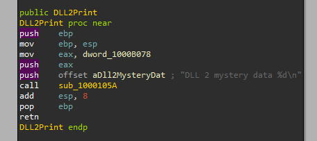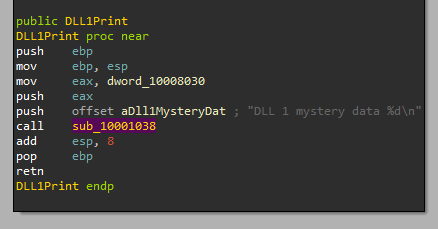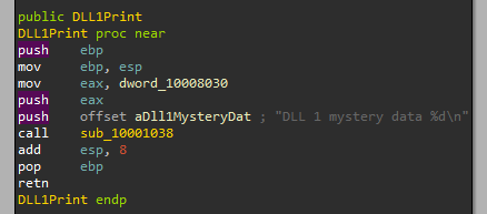 So we know the function will print “DLL 1 mystery data” followed by the data in dword_10008030.