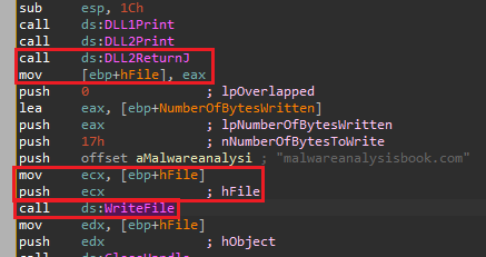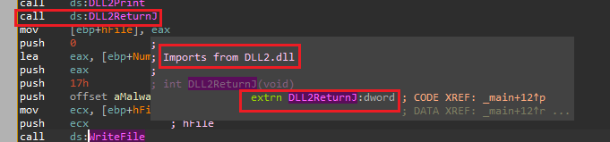 We can see that the handle for the file comes from the return value of the function DLL2ReturnJ, and we can see it is imported from DLL2.dll: