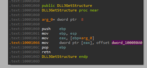 So it moves the address of the memory location dword_1000B0A0 into the memory location pointed to by eax (which is the argument passed), let’s xref this dword to see where it is being written to: