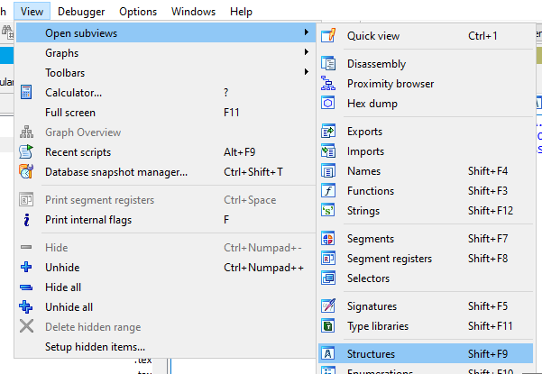 We start by opening the structure window by pressing (shift + F9) or by going selecting View -> Open subviews -> Structures: